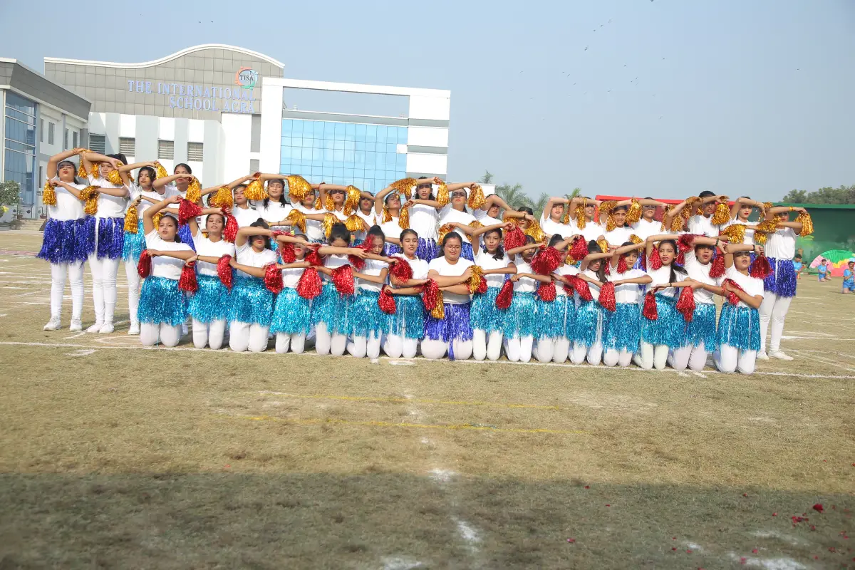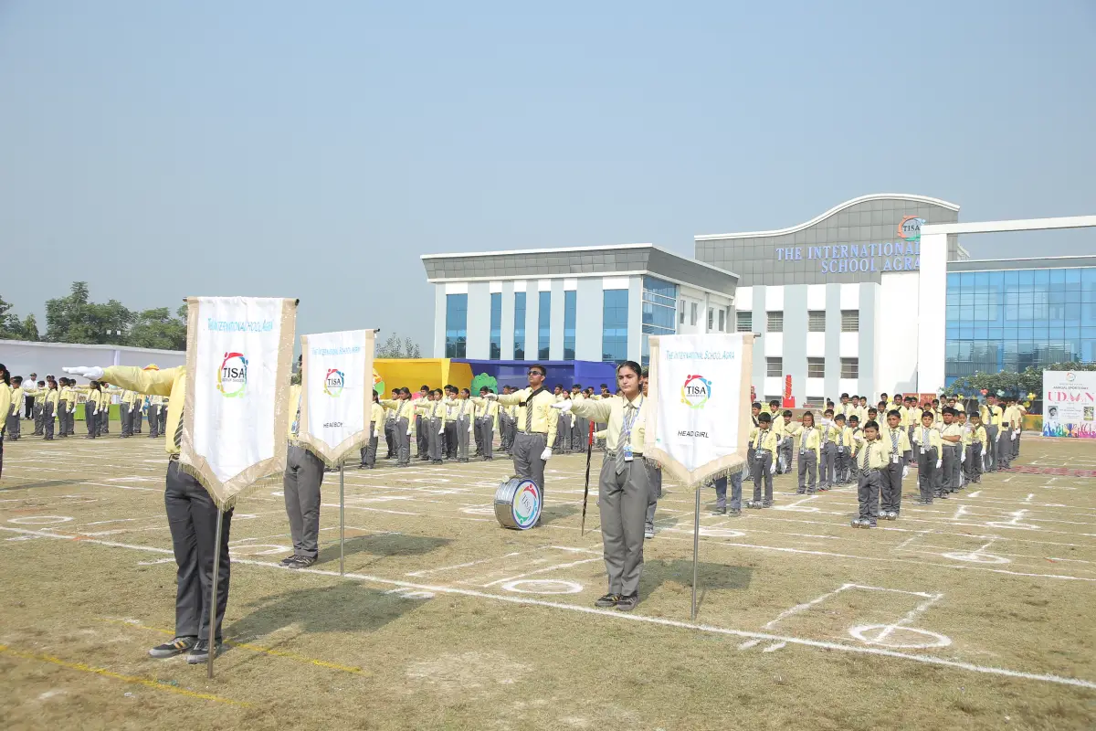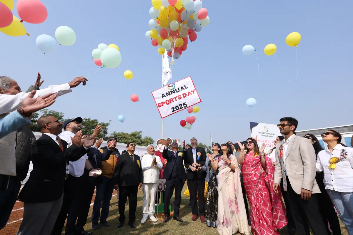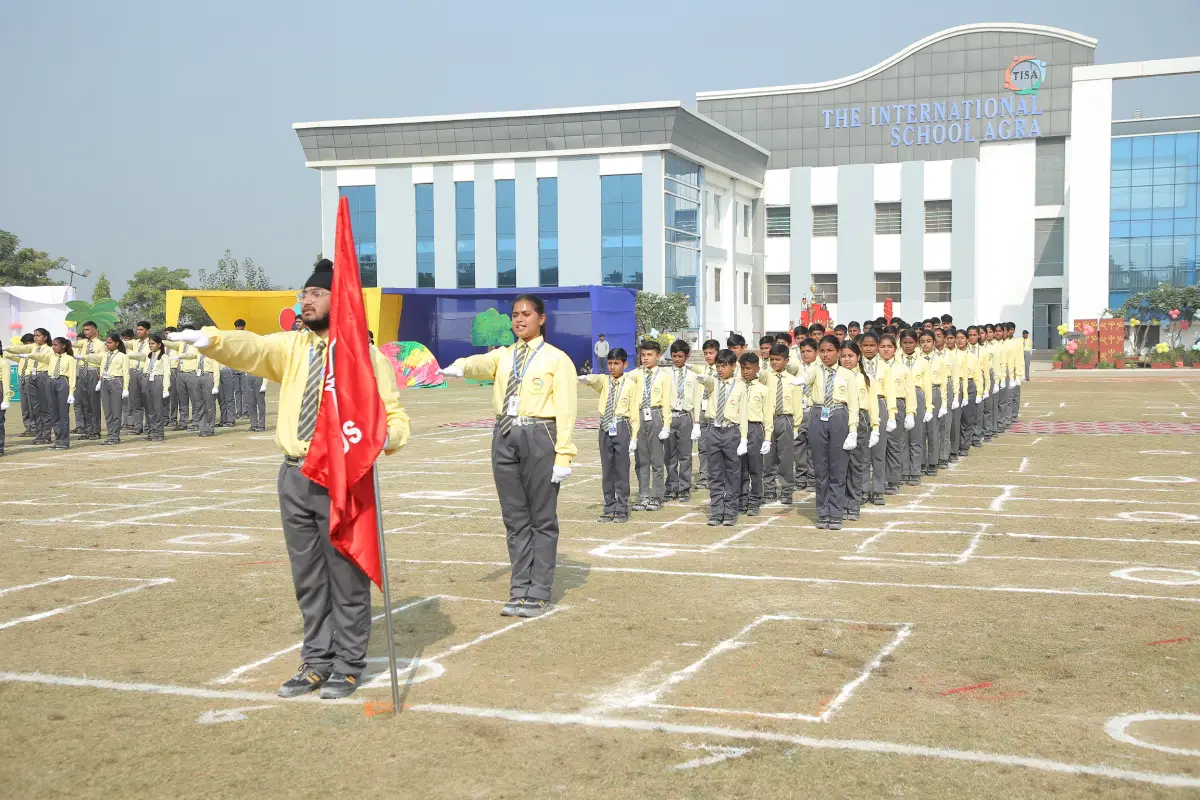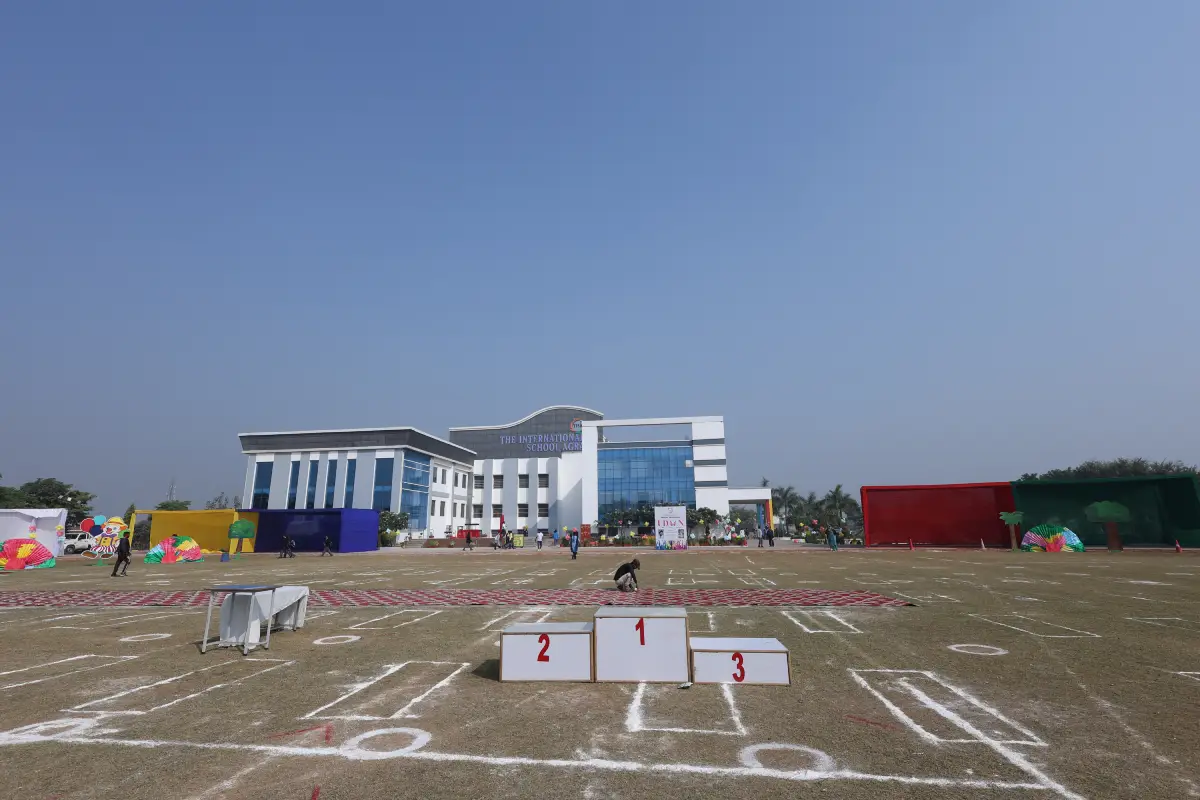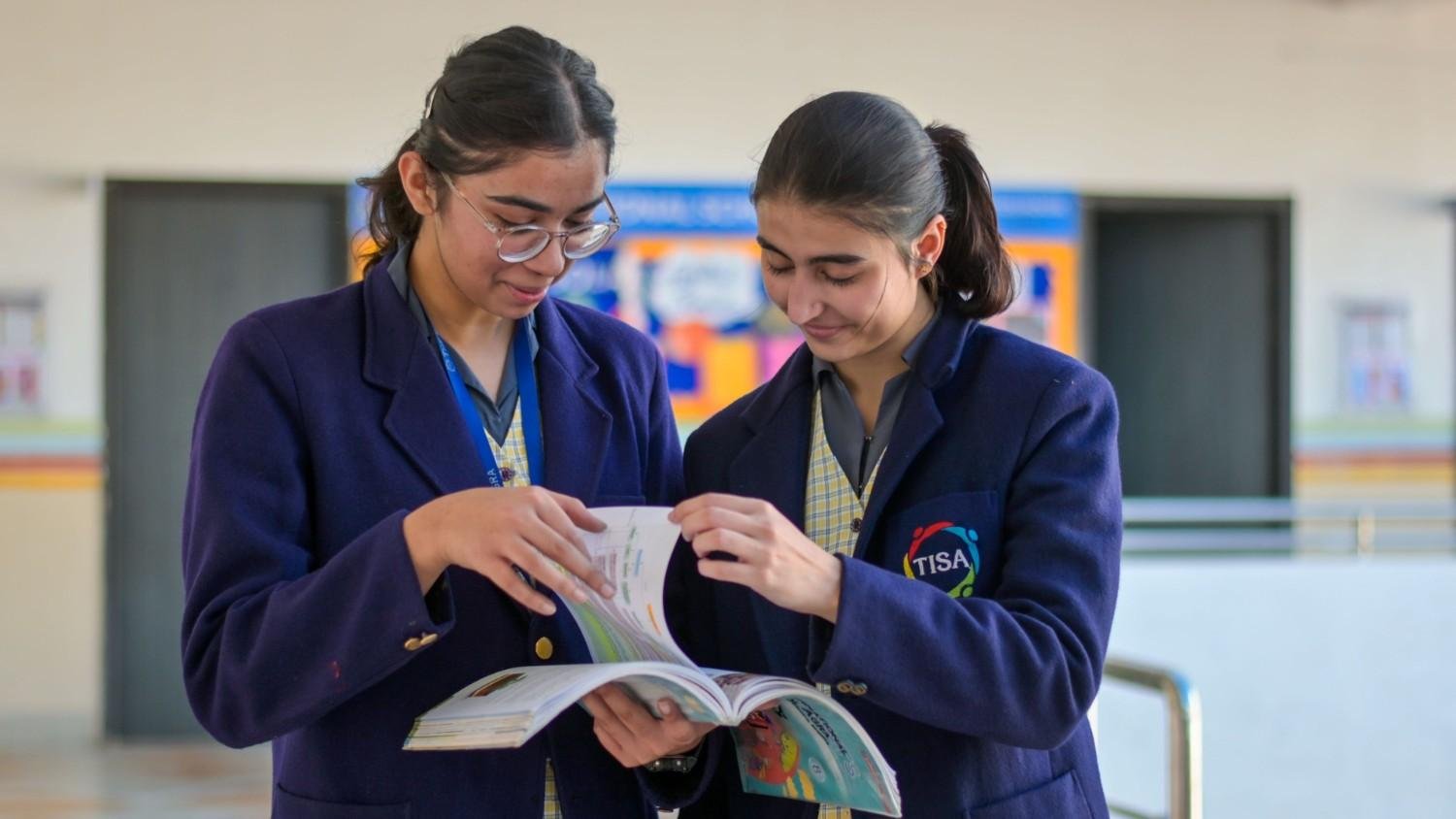 Two schoolgirls in uniform smiling and hugging in front of a yellow school bus labeled “The International School Agra.”