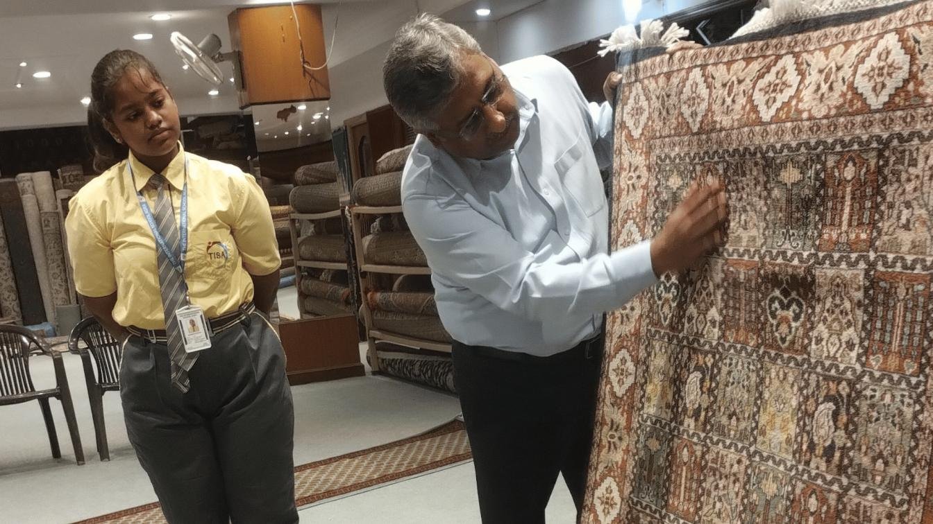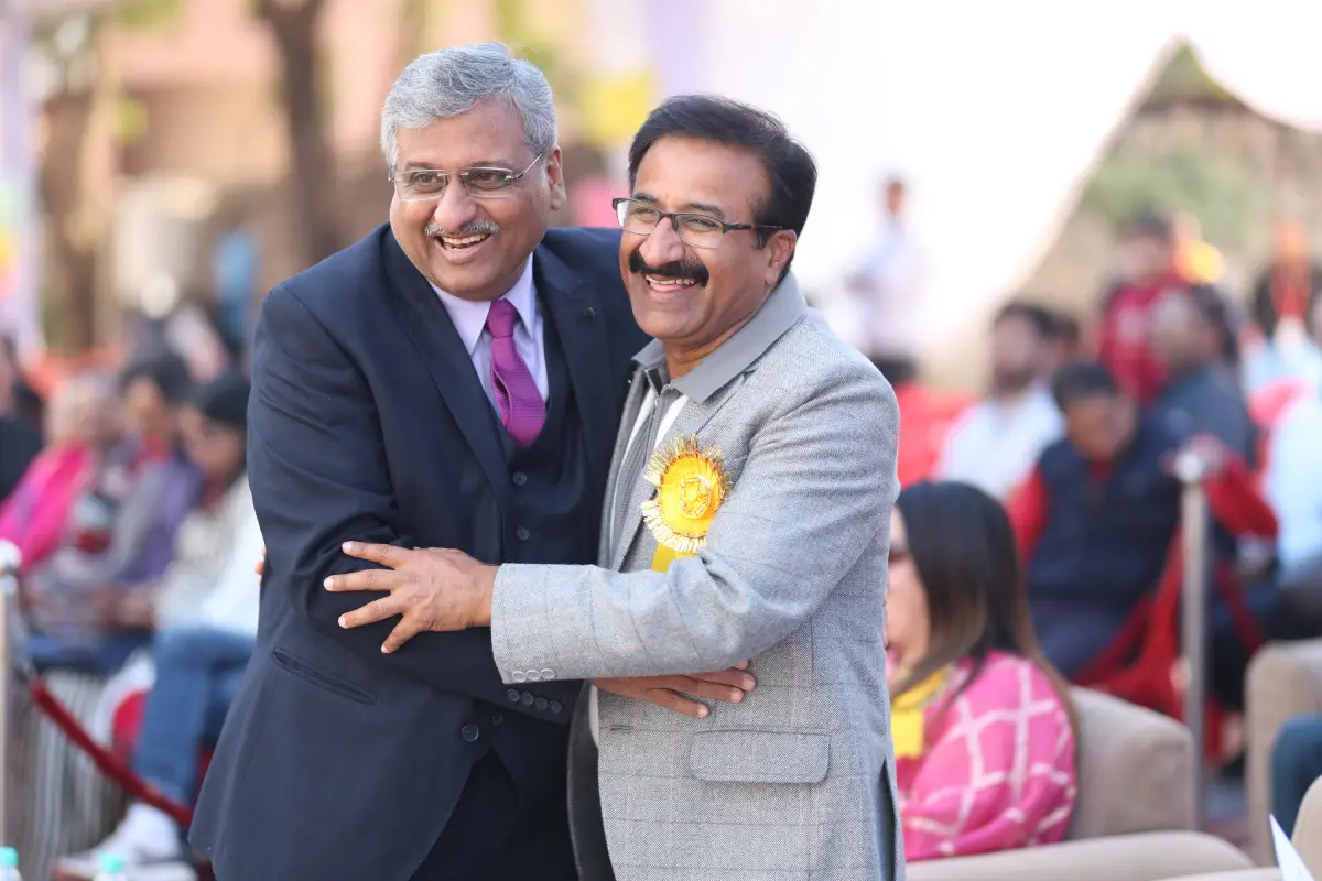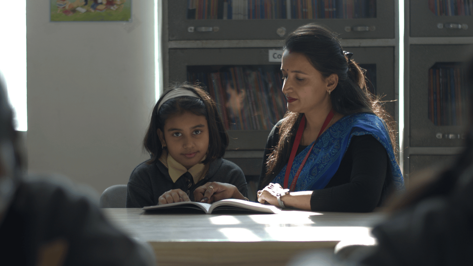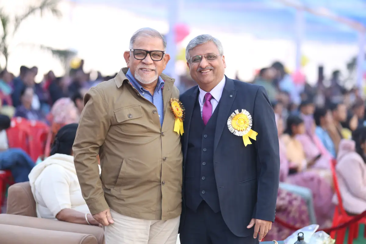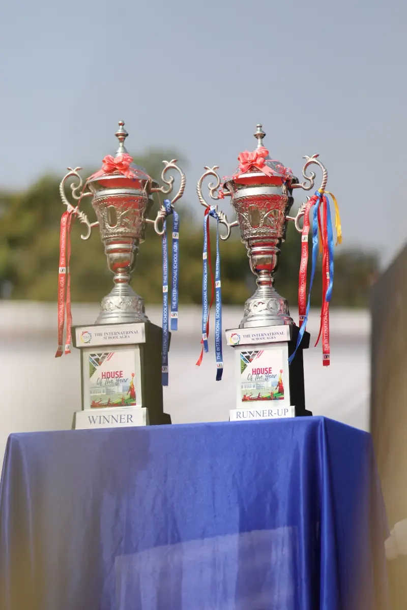 Two schoolgirls in uniform smiling and hugging in front of a yellow school bus labeled “The International School Agra.”